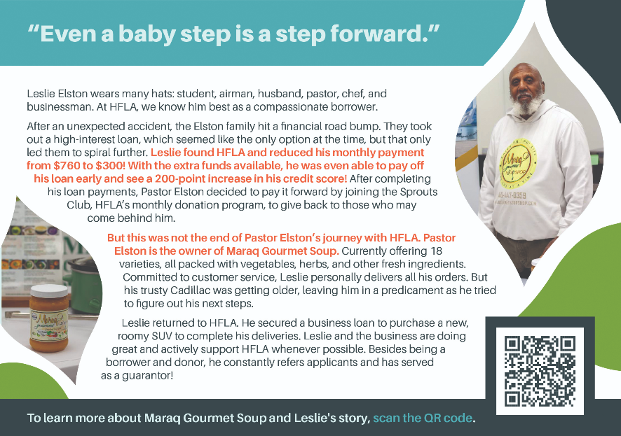 Relationships ebb and flow, but it is important to hold on to those that are mutually beneficial. HFLA was able to step in and help Leslie when a financial roadblock came along, and in turn, Leslie has been able to support other borrowers by paying back his loan in full and donating to HFLA to pay it forward.